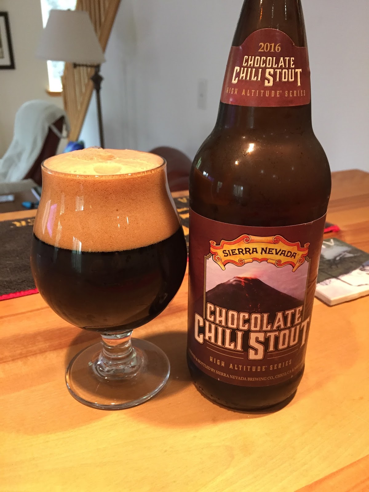 Sierra Nevada's Chocolate Chili Stout: I approached this brew with some trepidation, as I am typically not a fan of chili in beers. It poured opaque with a big tan head. The aroma was of dark chocolate and malted milk. Mouthfeel and carbonation were both good. On the palate there were rich chocolate and roasted notes up front, then the slightest amount of chili heat on the finish. The chili was very understated, which is how I like it if it has to be there at all; your mileage may vary. 8.5% ABV