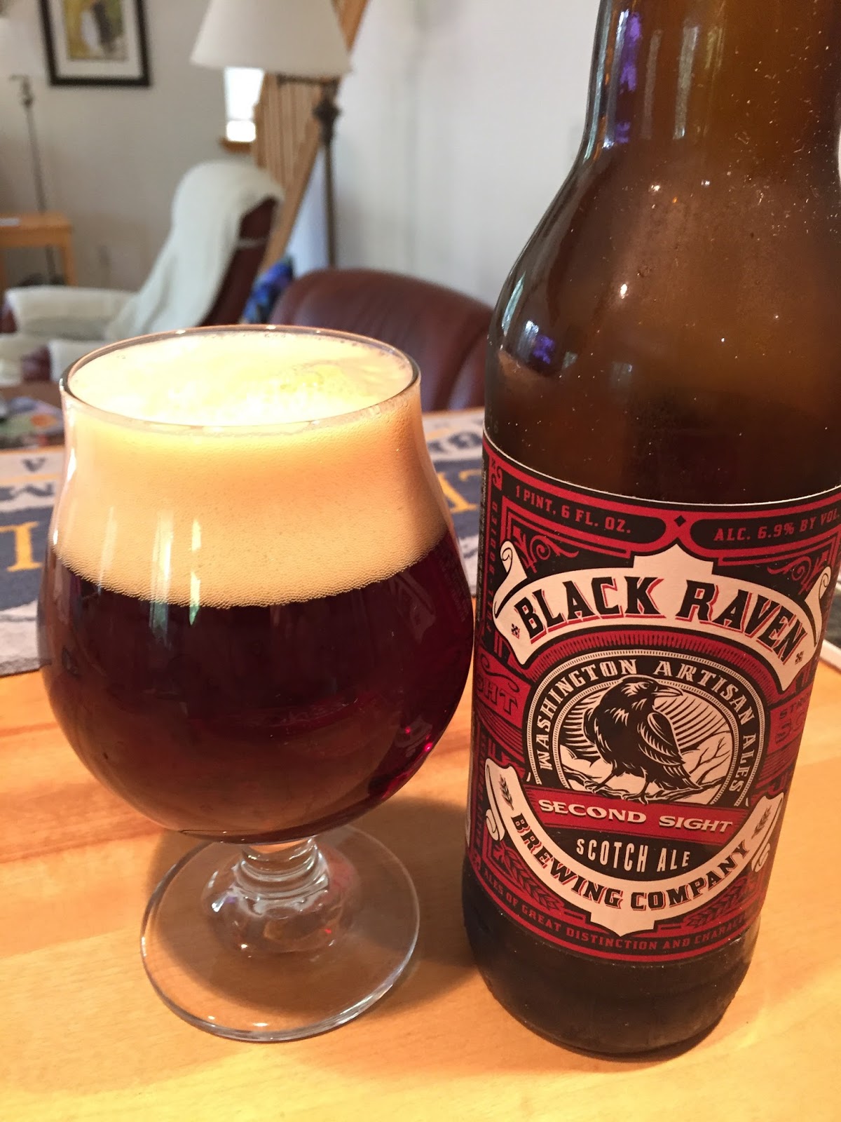 Black Raven Brewing's Second Sight Scotch Ale: It poured a translucent ruby with a nice, cream-colored head that left good lace on the glass. The nose was of caramel and malt. Carbonation was good and the mouthfeel was a bit on the dry side for the style. The flavor profile was malt forward, as you'd expect for a wee heavy, with no perceptible hop bitterness. Overall, a good wee heavy, though I would have preferred a bit higher finishing gravity, I think. 6.9% ABV, 34 IBUs.