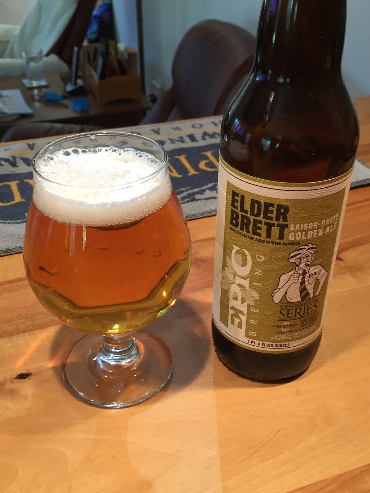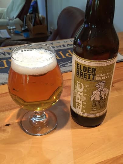 Epic Brewing's Elder Brett (Release #10): It poured a clear gold with a small white head that dissipated to a collar. The aroma was nondescript, but with some slight notes of brett funk. Mouthfeel was light and the carbonation was good. On the palate the beer was quite dry and had quite a bit of brett tartness, enhanced by oak elements from the aging in wine barrels. No perceptible alcohol, despite the 9.4% ABV. Overall, a very well-made brett beer.