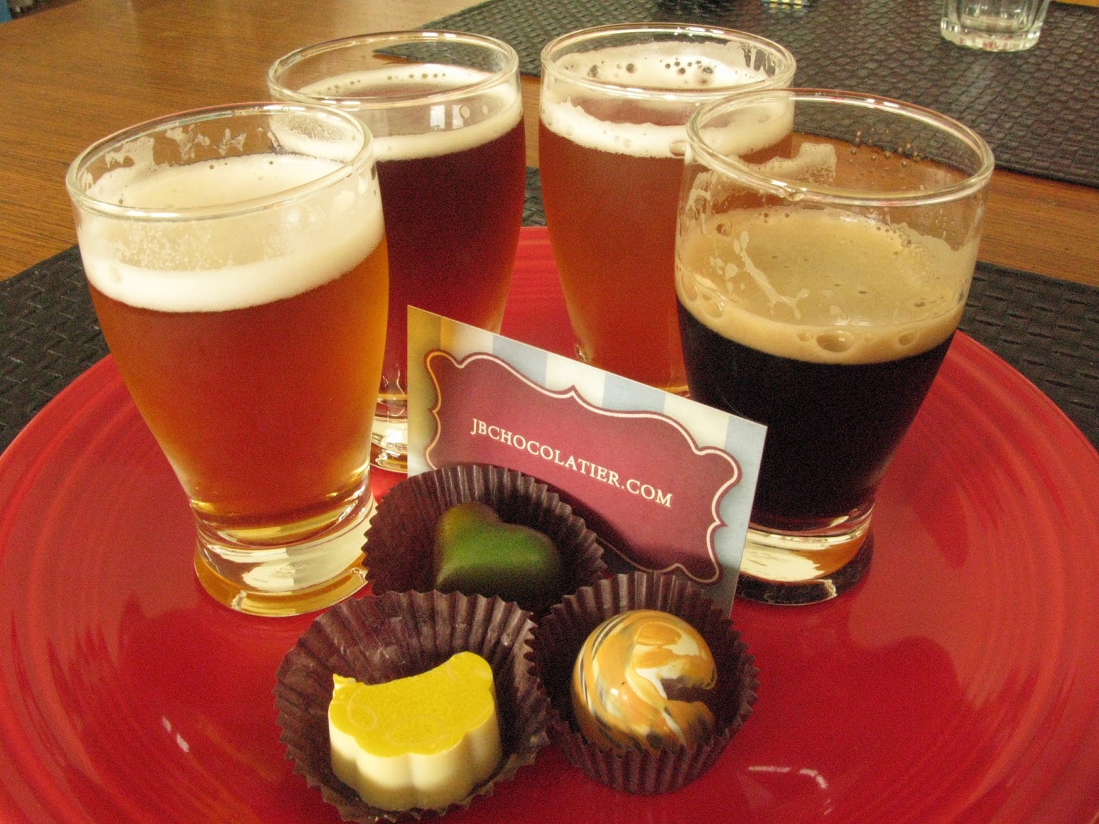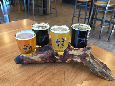 From left to right, Kolsch, Chocolate Porter, Honeymoon Hefe, Russian Imperial Stout. All beers I've had before, but not recently. Check out the cool sampler tray, made from birch roots by a local artist.