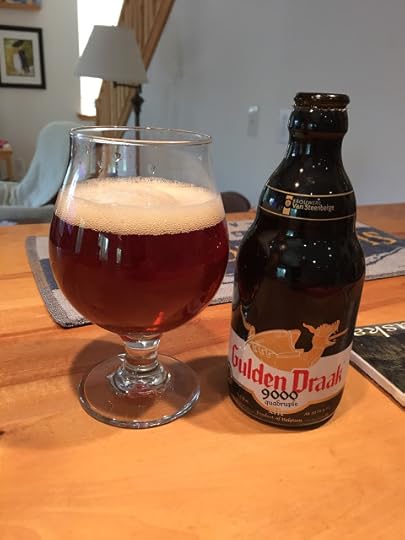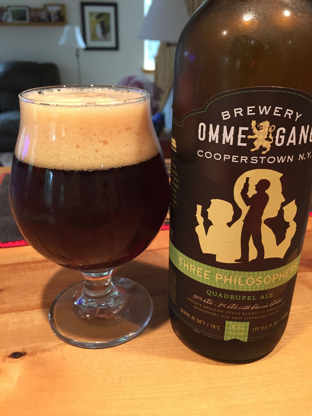 Ommegang's Three Philosophers Quad: A classic Belgian Dark Strong Ale from the excellent brewery in Cooperstown, NY. It poured a translucent ruby color with a nice cream-colored head. The aroma was of figs and plums. Carbonation was good and the mouthfeel was nice. The flavor profile was rich and complex, as you'd expect for such a big beer - more dark fruit notes, plus hints of sherry and tobacco, before gradually falling away to a long finish. An excellent interpretation of this classic style, and much more reasonably priced than imports from Belgium. 9.7% ABV, 19 IBUs.