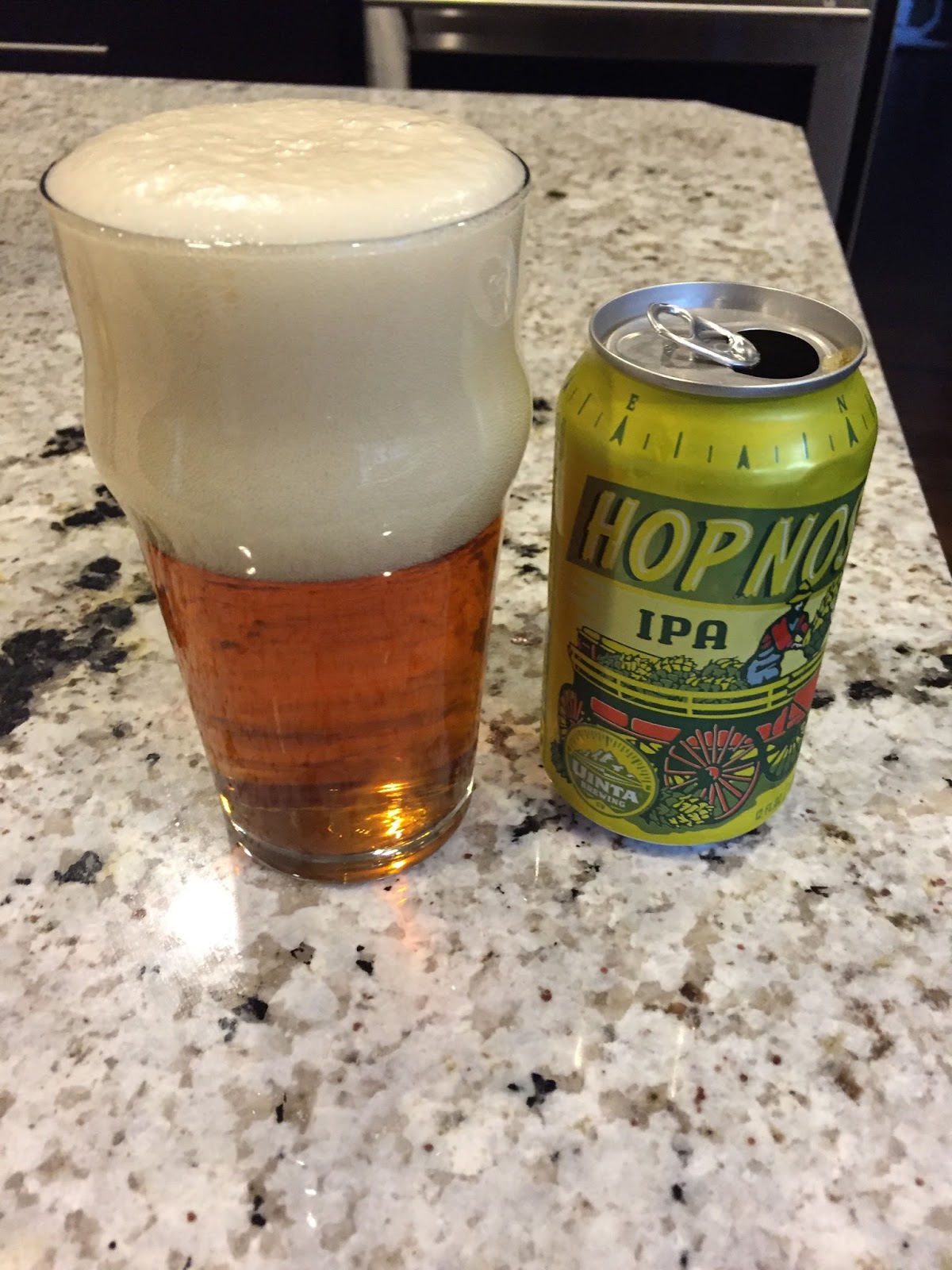 Uinta Brewing's Hop Nosh IPA: It poured a clear copper color with a big off-white head. The nose had plenty of fresh American hops in it. Carbonation was good as was the mouthfeel. The initial bitter attack was good but not excessive, followed by a decent amount of hop flavor on the back end. A very balanced and drinkable IPA. 7.3% ABV, 82 IBUs.