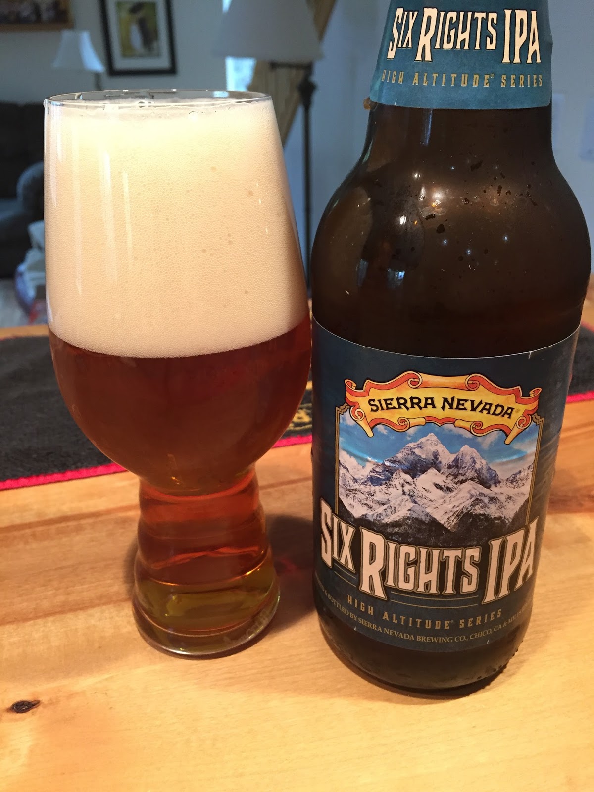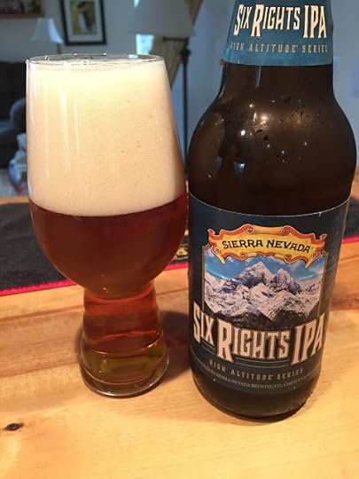 Sierra Nevada's Six Rights IPA: It poured a clear copper color with a big, off-white head. The nose was all citrusy American hops, but with a slightly unusual element that reminded me of tangerines. The mouthfeel was light and the carbonation was excellent. The initial attack had good bitterness, but balanced with a robust malt backbone. Overall, a very nice beer, walking the line between a single and double IPA. 8% ABV