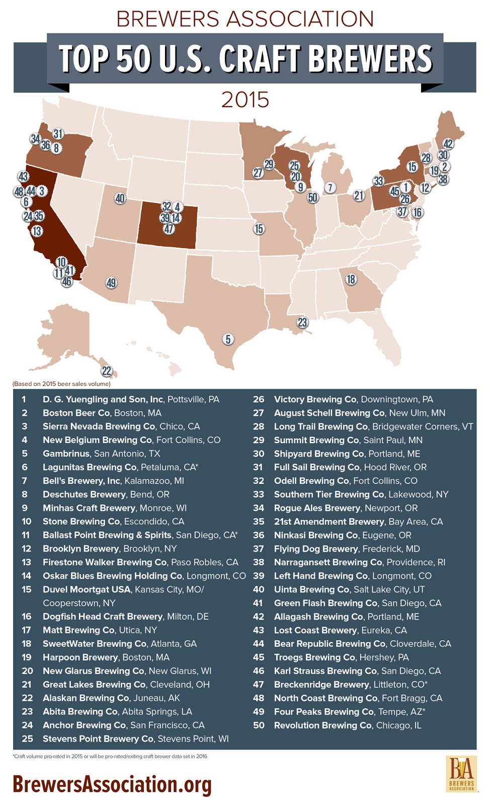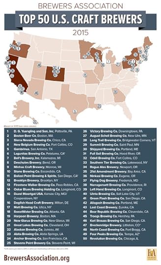 Speaking of the Brewers Association, it has also released the list of the top 50 Craft Breweries in the US, based on volume of beer produced in 2015. Here's the graphic showing who and where they are, though several of these (marked with an asterisk) have been bought out by the mega brands, so they won't appear on next year's list.