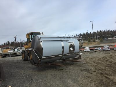 Here on the Peninsula, the big news is the arrival of Kenai River Brewing's new 20-barrel brewhouse from Specific Mechanical . It's been delivered to the new brewery (see pictures below, courtesy of Kenai River Brewing); now Doug Hogue just need to figure out how to put it all together!