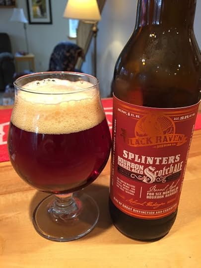 Black Raven Brewing's Splinters Bourbon-barrel Aged Scotch Ale: I am somewhat familiar with this brewery from its participation in the Great Alaska Beer & Barley Wine Festival , not to mention I'm a sucker for Scotch Ales, so when I saw this beer at La Bodega , I decided to give it a try. It poured a deep ruby color with a good cream-colored head. The aroma was strongly of bourbon, and only bourbon. Mouthfeel was good, a bit heavy as a Scotch Ale should be, and carbonation was okay. The flavor profile tracked with the aroma, i.e. overwhelmingly bourbon. For me, this beer illustrates the mistake many breweries make with barrel-aging: they allow the barrel to totally dominate the beer. If all I want is bourbon flavors, I'll drink bourbon! If I'm having a beer, I want it to taste primarily like beer, with some bourbon notes, not the other way round. However, if you want to drink a beer that tastes like bourbon and only bourbon, this one's for you. 10.8 % ABV.