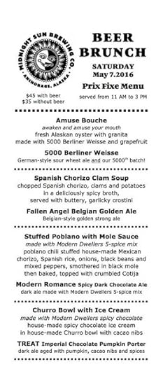 For the celebration on Thursday, which starts at 5 PM, MSBC will be tapping a firkin of Panty Peeler Tripel, cask conditioned with tequila soaked staves and lime zest. There will be 21 beers on offer, either on tap or in bottles. Friday will be First Firkin Friday ,with a special art show featuring art from the brewery's crew and their loved ones. There will be a firkin of 5000 Berliner Weisse, tapped at 5 pm. Then on Saturday there will be another Beer Brunch in The Loft , from 11 am to 3 pm. Here's the menu: