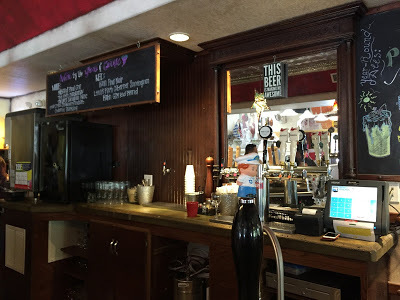 The first brewery I visited was the American Brewing Company , at 180 W. Dayton Street. It, had a strong industrial vibe. In fact, the main train tracks through town ran just a few feet from its entrance door. There was free popcorn and other food for sale, like pizzas. I didn't get an exact count, but there looked to be at least a dozen different beers on offer. Here are a couple of shots of the tap room that I took.
