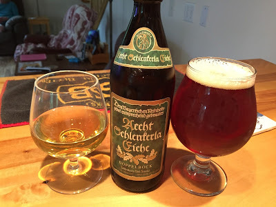 Schlenkerla's Smoked Doppelbock: A new beer (at least to me) from the German brewery that's world-famous for its rauchbiers. For this beer, the malt was smoked using oak, rather than some of the more traditional woods. It poured a dark honey color with a small, off-white head that dissipated to a collar. The nose was of caramel and smoke. Carbonation was good and the mouthfeel was medium. On the palate, it was all sweet, clean caramel and malt notes, plus lots of smoke. A very tasty entry to the smoked beer category, and one I used to chase a dram of Lagavulin single malt Scotch Whisky. 8% ABV.