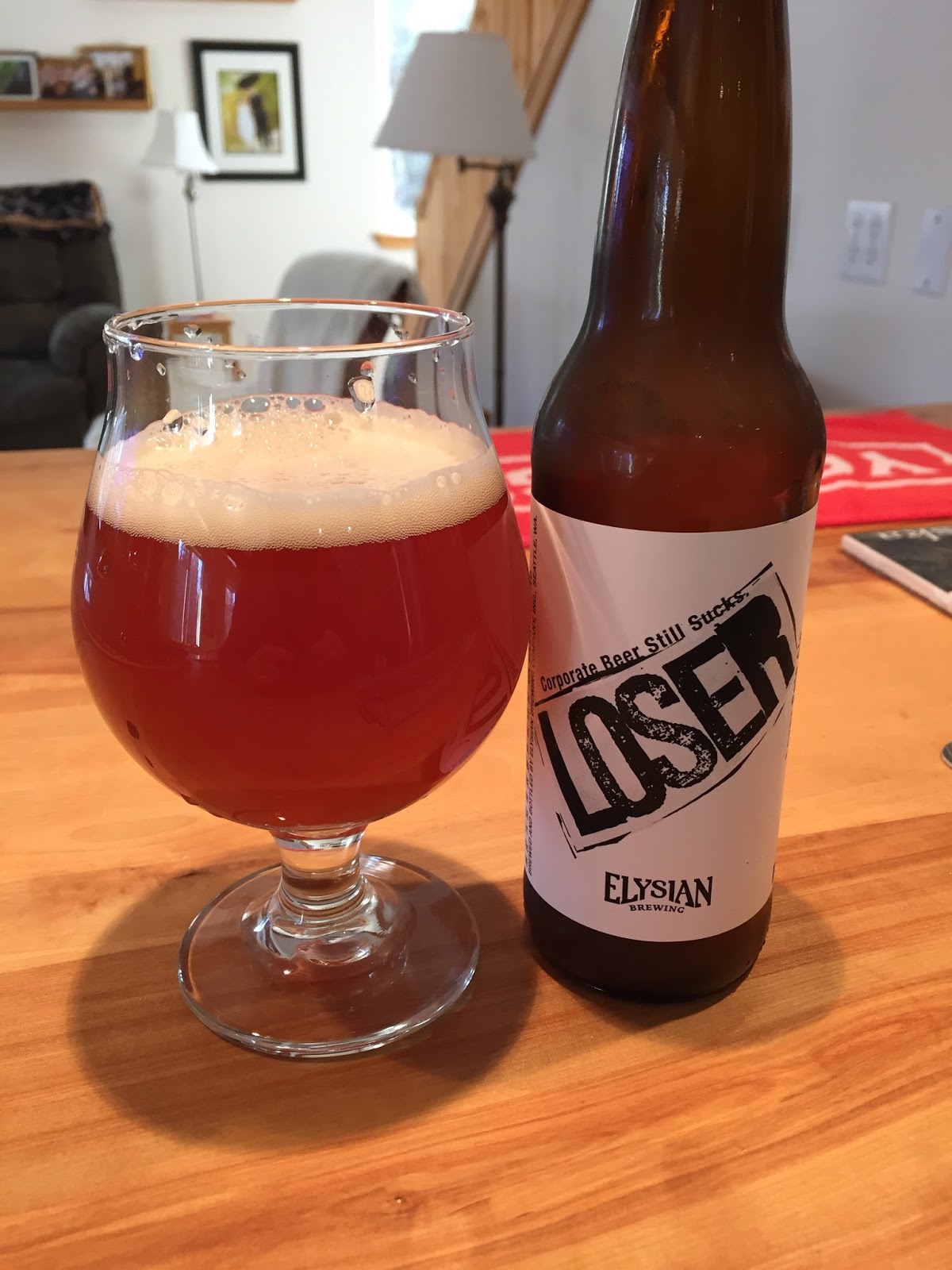 Elysian Brewing Loser Pale Ale: After its purchase by AB-InBev, I decided that I would no longer purchase Elysian's beers, but I won this bottle in a raffle at the Kenai Peninsula Brewing & Tasting Society Meeting this month. It poured a slightly cloudy copper color with a off-white head that dissipated to a collar. There were aromas of toffee and light tropical fruit notes in the nose. Mouthfeel was light and carbonation was okay. There were more toffee notes on the palate, along with a balanced malt-hop profile. A perfectly fine pale ale at 7% ABV. Nothing wrong with the beer, but I choose not to give my hard-earned beer dollars to the Evil Empire...