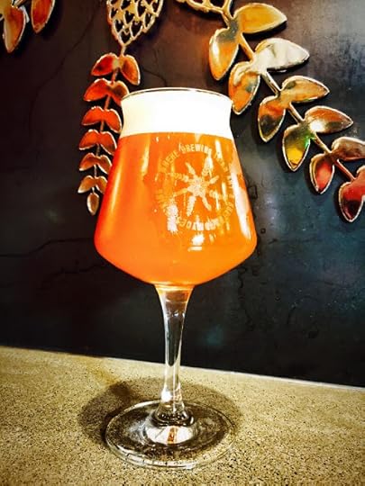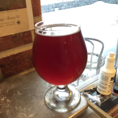 St. Elias Brewing's Green Giant Imperial IPA: I reviewed an earlier version of this beer on 11/19/2014, but this release is sufficiently different that I thought it rated its own review. It poured a cloudy yellow-orange color with a small off-white head that dissipated to a collar. The aroma was chock full of tropical fruit and citrus; the Galaxy hops are strong in this one! Carbonation was good and the mouthfeel was medium. The flavor profile is super tropical fruit juicy, almost like a stick of Juicy Fruit gum. The bitterness becomes more noticeable on the finish. Comparing it to my notes from last year, it seems to me that Zach has amped up the tropical fruit notes considerably in the version. And in the picture below, pay no attention to the logo on the growler; I got my glassware mixed up again...