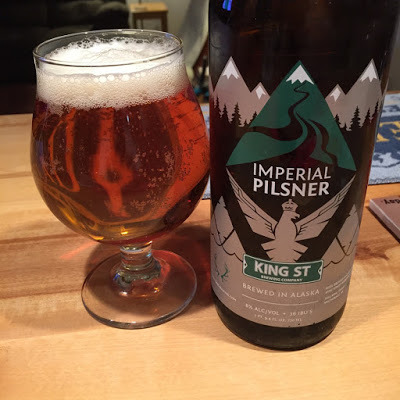 King Street Brewing's Imperial Pilsner: It poured a clear, slightly reddish-gold color with a nice cream-colored head. The aroma had some biscuity malt notes, as well as noble hops. Carbonation was good and the beer was nice on the palate. The flavor profile let you know it was a big beer, with plenty of biscuity malt notes. Very much in the style of a German pils, just amped up to 8% ABV. 36 IBUs.