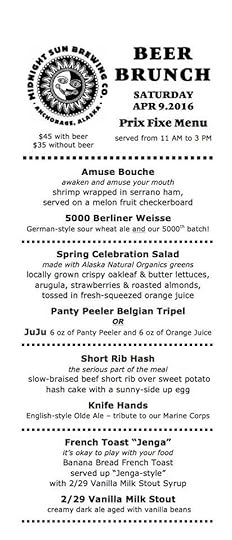 Speaking of food, Midnight Sun Brewing Company has posted the menu for its Beer Brunch , happening next Saturday, April 9th. No reservations, just first come, first served.