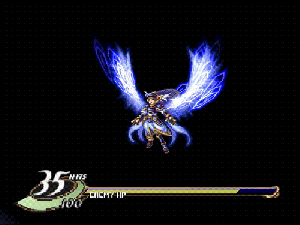 Every character has a weapon specialty and a special attack (almost like a limit break that can potentially be activated several times in a battle, or big and dramatic magic for the sorcerers). Lenneth Valkyie’s attack is called Nibelung Valesti. She would fly up in the middle of battle, spread her wings, materialize a spear, and send it toward her enemy in the shape of a blue phoenix-looking, fiery lance of force.