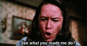 “‘What’s the matter’? I’ll tell you ‘what’s the matter’! I go out of my way for you! I do everything to try and make you happy: I feed you, I clean you, I dress you…and what thanks do I get? ‘Oh, you bought the wrong paper, Annie. I can’t write on THIS paper, Annie.’ Well, I’ll get your stupid paper, but you’d just better start showing me a little more appreciation around here, Mister Man!” *slams the full pack of paper onto Paul’s wounded legs* — Annie Wilkes, Misery (movie)