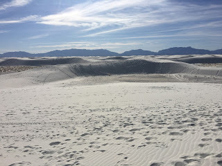 White Sands National Monument (New Mexico again). A unique spot, with white gypsum salt sand dunes in a valley surrounded by mountains, some tipped with recent spring snows. The sand is surprisingly cool to the touch, and we hiked barefoot, as that apparently is one of the things to do there. Sledding is the other, but we passed on that. This was, if I remember rightly, the first truly hot day of our trip.