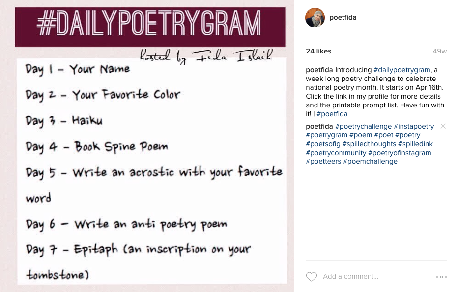 I'll be participating along side you. The prompts are up to your interpretation and creativity. You can repost my challenge graphic on your Instagram profile for reference. Be sure to tag your poems on Instagram with #dailypoetrygram so we can all see it.Tag me (@poetfida) so I can leave some love.