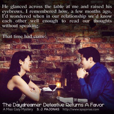 Woo hoo! It’s Release Day around here!! THE DAYDREAMER DETECTIVE RETURNS A FAVOR, the fourth book in the Miso Cozy Mysteries Series, is now available. I really enjoyed writing this book even though it took me many months to get it all out and onto my computer. There were a lot of parts I truly struggled with and other parts of this novel just flew from my fingers. It was a labor of love to be sure.