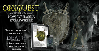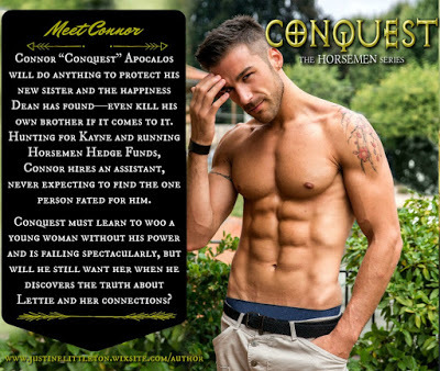 Connor “Conquest” Apocalos will do anything to protect his new sister and the happiness Dean has found—even kill his own brother if it comes to it. Hunting for Kayne and running Horsemen Hedge Funds, Connor hires an assistant, never expecting to find the one person fated for him.