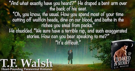 Well Done T. F. Walsh! Cloaked in Secrecy is HOT HOT HOT !!! The description of each characters are amazing. The love story between ENRE and ALENA was told so that I cannot get my Kindle out of my hand. I don't usually like that the story is narrated in alternating characters point of view but this time each words draws me in and make me feel each respective characters telling the story. I just wish there is a continuation of DACIANA story in there. More of her point of view while is ENRE is playing with ALENA. I cannot wait for the next CLOAKED series.
