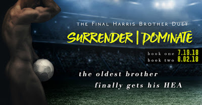 Surrender is part one of The Final Harris Brother Duet and concludes with Dominate. The Final Harris Brother Duet reads great as a duo, but to maximize enjoyment, check out the first three brothers’ books in Challenge, Endurance, and Keeper.