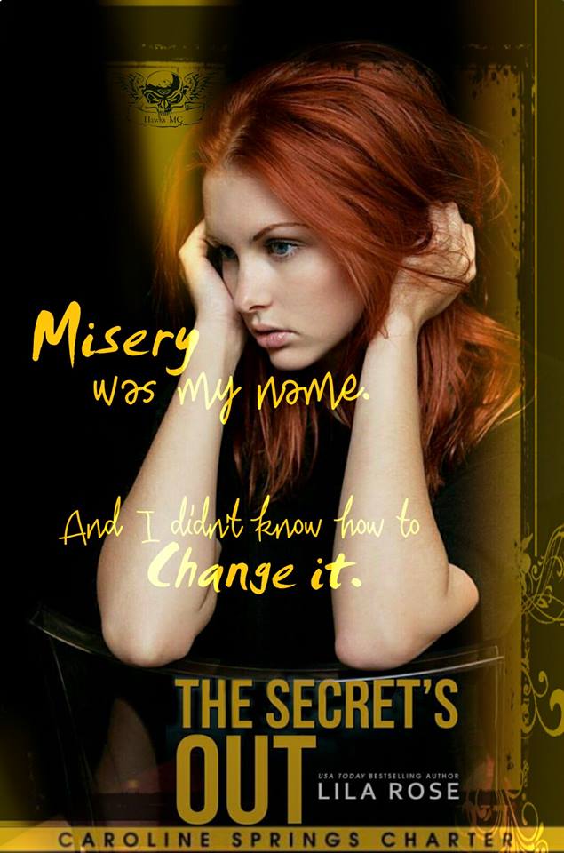 Title: The Secret's OutAuthor: Lila RoseSeries: Hawks MC #1: Caroline Springs CharterGenre: MC Romance Cover Designer: Robin Ludwig: Go Book Cover Designs Editor: Hot Tree Editing Release Date: October 6th