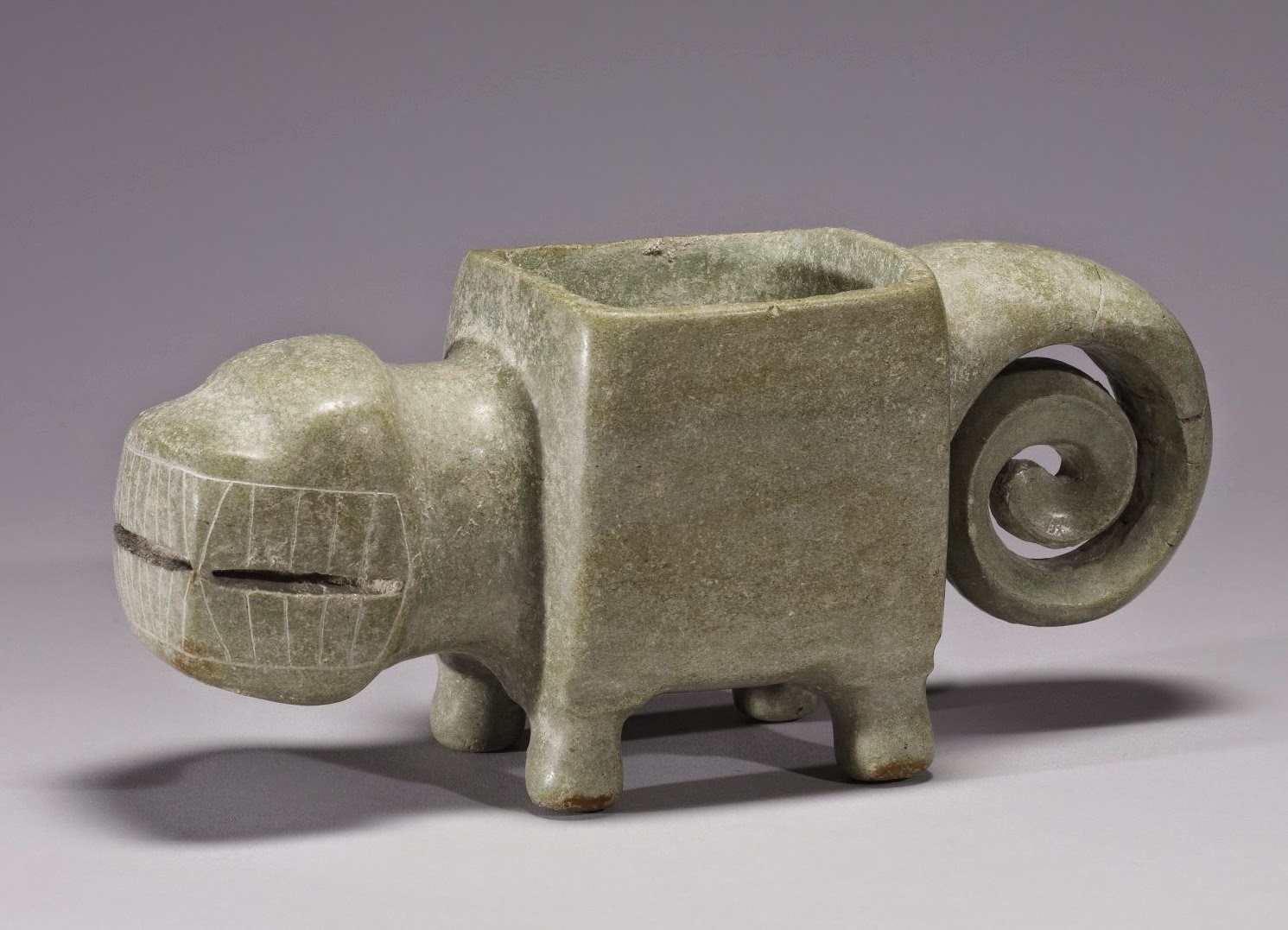 A mortar of green stone carved and polished to resemble a jaguar.From the Chorrera culture, eastern Ecuador, c. 1500–300 BC.Objects like this are thought to have been used by shamans to preparehallucinogenic snuffs that aided them in their interactions with the spirit realm.Creative Commons Attribution-Share Alike 3.0 Unported LicenseThe Walters Art Museum, Baltimore.