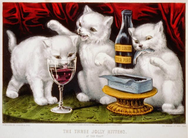 Three Jolly Kittens: At the Feast Three kittens party like it’s New Year’s Eve.Hand-colored lithograph by Currier & Ives, New York, ca. 1871.Via Library of Congress Prints and Photographs Division.