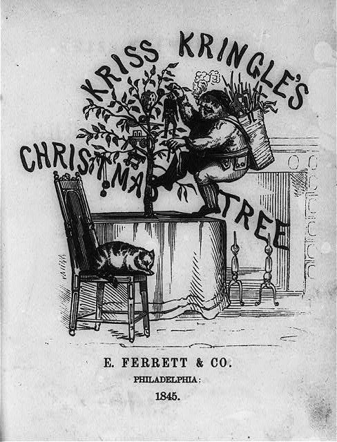 Kriss Kringle’s Christmas Tree An early version of Santa trims the tree while a cat supervises.Woodcut. Artist unknown.E. Ferrett & Co., Philadelphia, 1845.Via Library of Congress Prints and Photographs Division.