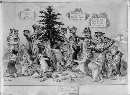 Cats Decorating Christmas Tree (1906). Most cats knock the ornaments off a Christmas tree, but this group is having a grand time decorating their tree. Artist: Louis Wain (1860–1939).Detroit Publishing Co.Via Library of Congress Prints and Photographs Division.