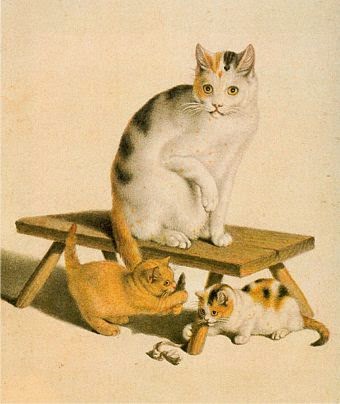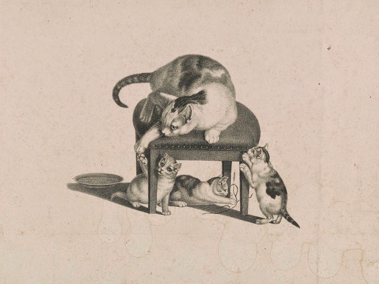 Mother cat on stool playing with kittens.Lithograph, ca. 1820–1860.Lithographer: Joseph Brodtmann (1787–1862).Artist: Gottfried Mind (1768-1814). Via Library of Congress Prints and Photographs Division.