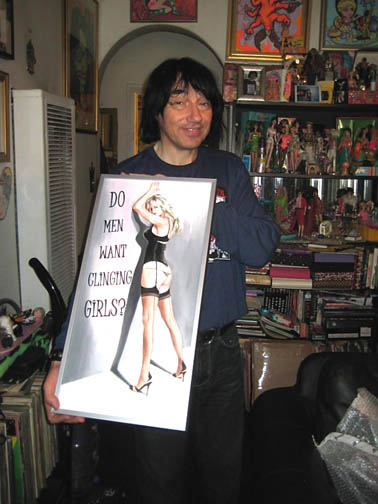 I discovered the great art of Sharon Leong when her work was included in a book my wife Rebecca was in called "Vicious, Delicious and Ambitious", compiled and edited by Sheri Cullison. I net her at various shows promoting the book, La Luz De Jesus and once again, at Copro Nason. The content of her art combines bizarre erotica with the snarling menace of vintage dime store paperback novels from the Forties and Fifties. The painting I'm holding pictured above is titled "Do Men Want Clinging Girls?"