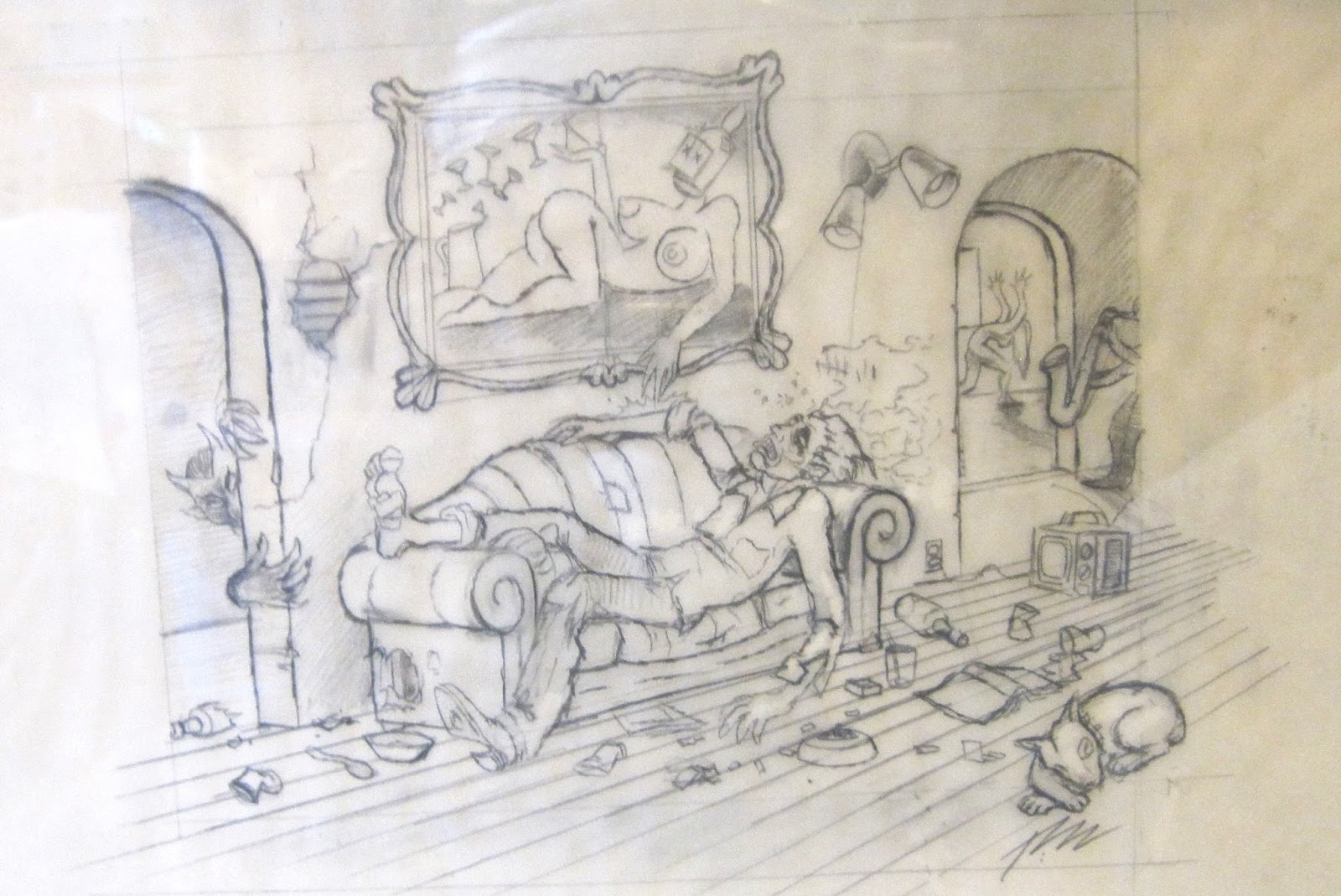 Although I couldn't afford any of The Pizz's paintings we managed to work a deal where we could get a few of his master sketches for his paintings in exchange for a handful of Nauga monster dolls we made (we even made a black one for him!). In exchange we got the sketches for Hardware, DT's and The Stoner and The Stripper, all based on songs I've written and recorded. By the way, Pizz was suppose to have painted the cover for my first album, but the record company guy was dead set against it. He thought some shitty blurred Xerox of me was more aesthetic. What a wasted opportunity.