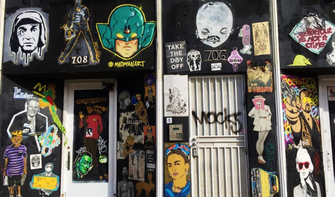 One wall which probably won’t have to lose sleep over being painted over is the vintage store wall on the corner of Melrose and Curson. An area at once chic, consumerist but funky, this wall is a great jam of multiple artists allowed to post their work together in one cool as hell gallery (of sorts). This is how Melrose Avenue got its groove in the first place, and it’s reassuring to know that some people still remember and probably revere the old days. The days of art over money, however short lasting that was.