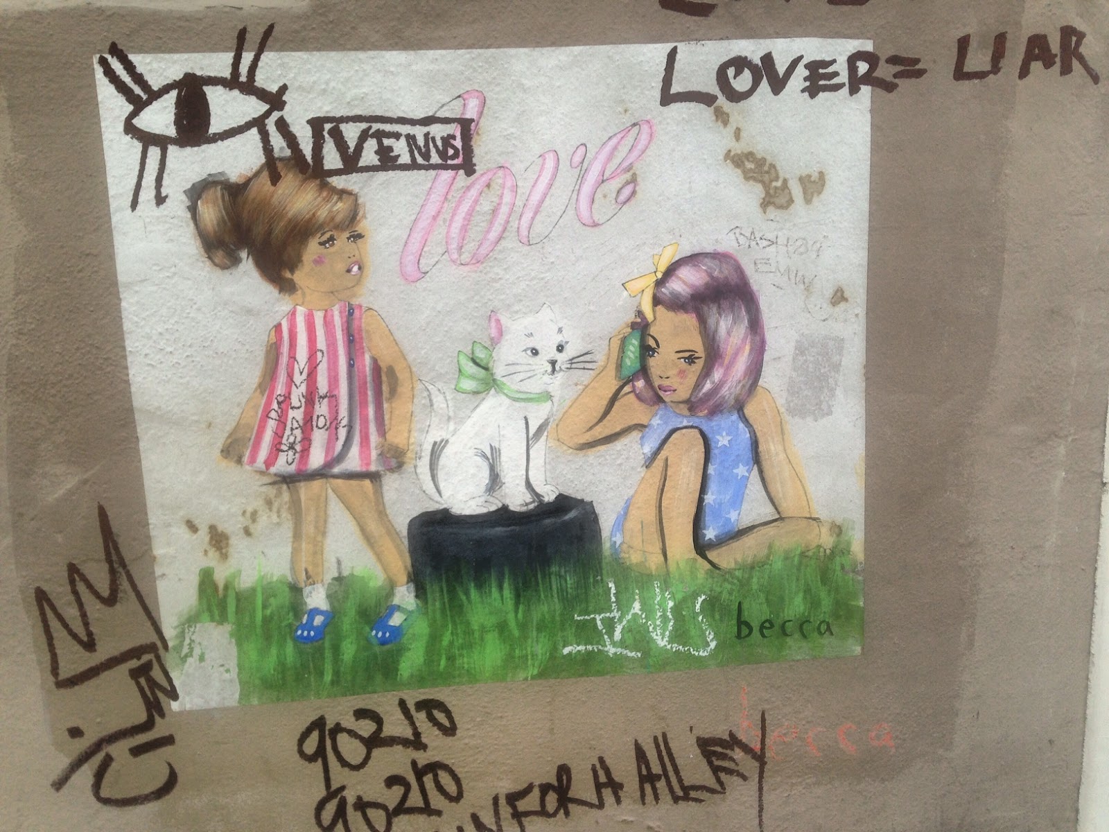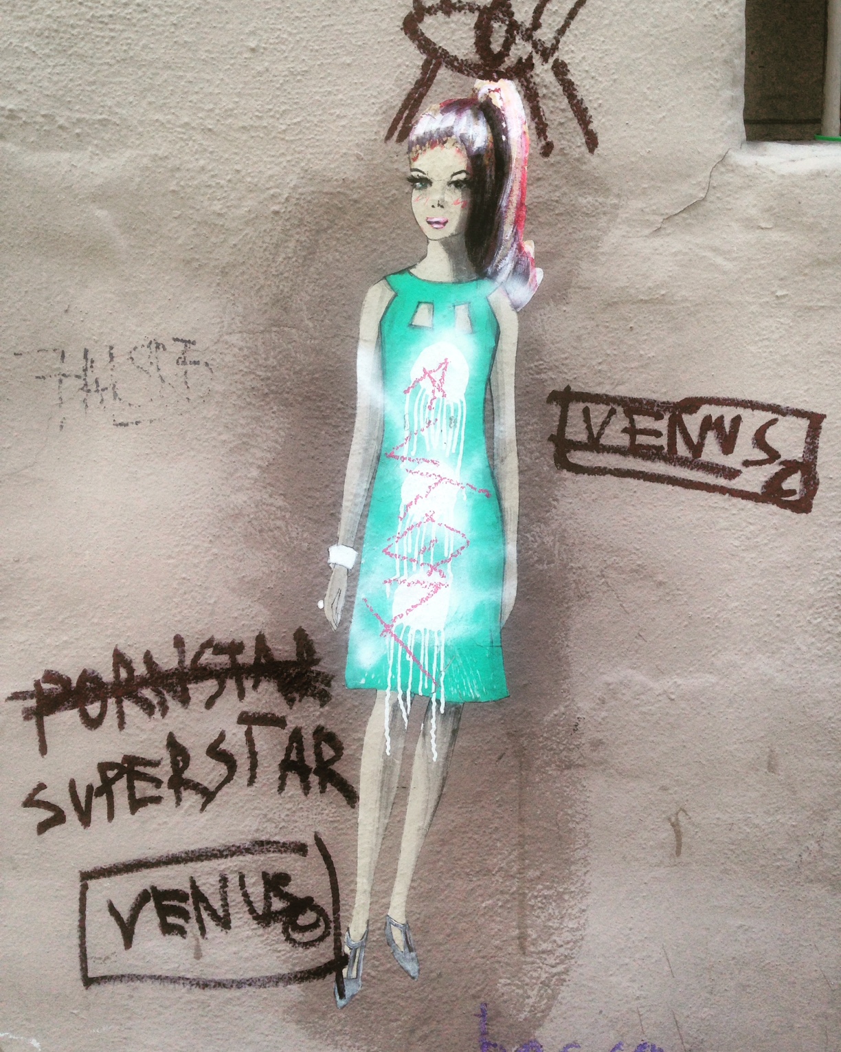 I also ran into several pieces in the alleys (!) of Rodeo Drive. Here’s one of Barbie’s mod cousin Casey with the line “PORNSTAR” atop her crown poised above her head. Could this be a soft indictment of all over-pampered blondes of Beverly Hills? Hard to tell, and even harder now that it’s been painted over.