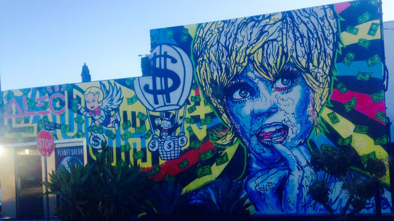 Alec Monopoly’s art can be seen all over Hollywood and mostly employ the iconic character Uncle Pennybags from the Monopoly board game. Of all his works my favorite was the Goldie Hawn mural on Melrose one block west of Crescent Heights. Showing Hawn in her Laugh-In go-go dance resplendence with blue alien skin, it was an extra-large image startling to all those engaging in conspicuous consumption along the street of high-end fashion boutiques.