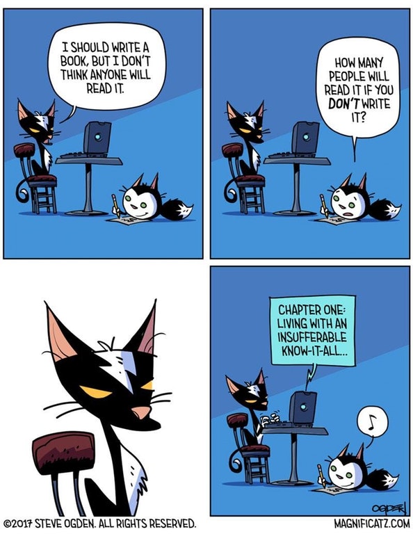 It’s important to have a place to work that’s comfortable and relatively free of distractions. You don’t need a desk. Want to work in your jammies? Go right ahead, but set aside time to write. How much is up to you, but try to have some consistency. You’ll never finish that Great American Novel if you don’t give yourself time to work on it.