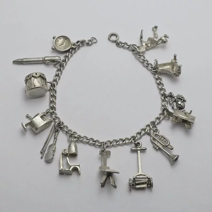 It was Queen Victoria who shoved charms into the world of fashion and is credited with popularizing the charm bracelet as we now know it. When Prince Albert died, she created mourning charm bracelets. Victoria's preference was for gemstone charms and lockets containing the hair (yuck) or tiny photographs of loved ones (better.) She even had charms created to give to her family and friends, most of whom were European nobility. The popularity of charm bracelets spread throughout the royal houses and filtered down to the commoners and then across the Atlantic. Tiffany made its first version of a charm bracelet with a tiny heart in 1889. It was a big hit. Different iterations of flowers, birds, and animals quickly followed.