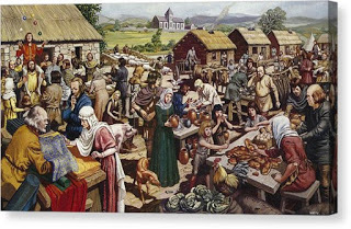 Fairs weren’t only established around cathedrals; other buildings did nicely. Some were even founded by religious orders. One of the largest was established in 1036 by the Abbey of St. Vaast at Arras in Germany. Clerics discovered not only the advantages of having goods and services for sale close at hand, but also the joy of taxes. Pheasants, meanwhile, discovered the joy of discovering loopholes in revenue laws. They staggered into Arras weighed down by bundles of goods on their backs because merchandise arriving on foot wasn’t taxed. Can’t carry all those pigs to market in a sack? Make sure to use a cart with an unshod horse. Shod horses were taxed at two deniers apiece.As years pas and the popularity of fairs spread, temporary structures and itinerant merchants were replaced by fixed stalls and benches. The spread of commerce brought more money into circulation and merchants began to construct small shops, often with storerooms behind and living quarters above. It wasn’t uncommon for similar merchants to concentrate in a particular area; one street would be devoted to butchers, another to spice merchants, others to trades such as cloth, leather goods, or metalworking.