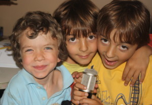 In that book/audiobook, Bash learns how to share his canine companion, Lucy, with a kids’ Special Olympics team. Below is a picture of Michael (far left), Adam and Matthew recording the kids’ audiobook. They’re all 7 years old.