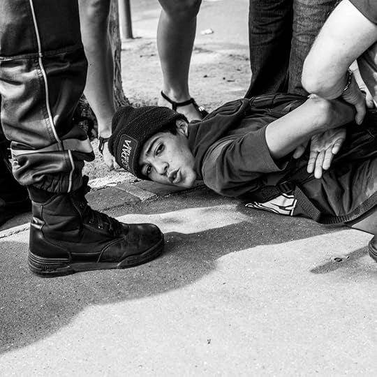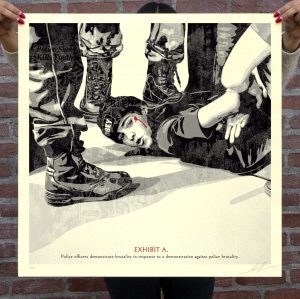My work is observational, not documentarian. I try to capture moments, feelings – less how things are, more how I experience them. Years ago, while in Paris, I came upon several heavily armored cops standing over a kid in a t-shirt who they were detaining, forcefully, aggressively. A blatant and grotesque display of the imbalance of power which reminded me of similar situations my friends and I have experienced first hand all too often. Of course, sadly that isn’t a unique experience. Shepard wields his art like weapon, relentlessly fighting for for a better tomorrow. With this image, I’m honored to have the chance to provide some ammo for that fight. Shepard’s voice has always been thoughtful and poignant, as an artist and as a friend. This collaboration gives an amplified voice to a silent image, injecting an enduring message into a fleeting moment.
