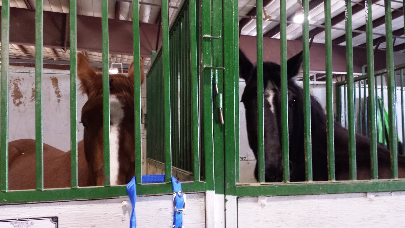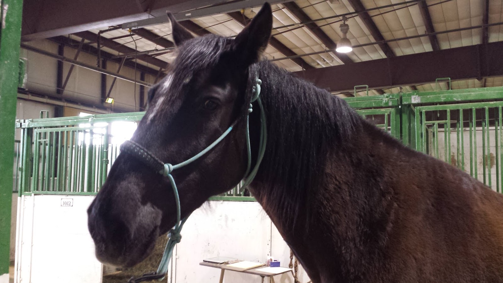 "We refused to get in our trailer, and now we're in jail?!"Mom and Bill made great time and the horses were in their jail cells stalls just a hair before noon. We hung water buckets and hay nets, then headed off to see the Colt Starting Challenge. A couple of hours later, we got back to the barn to check in on the horses and I was told that Skeeter caused a bit of excitement.