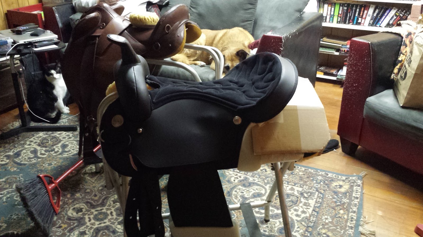 We've been living with the saddle in the living room for a couple of days and I joked that it was becoming our tack room, but last night *my* new saddle was delivered and now the living room is really a tack room.