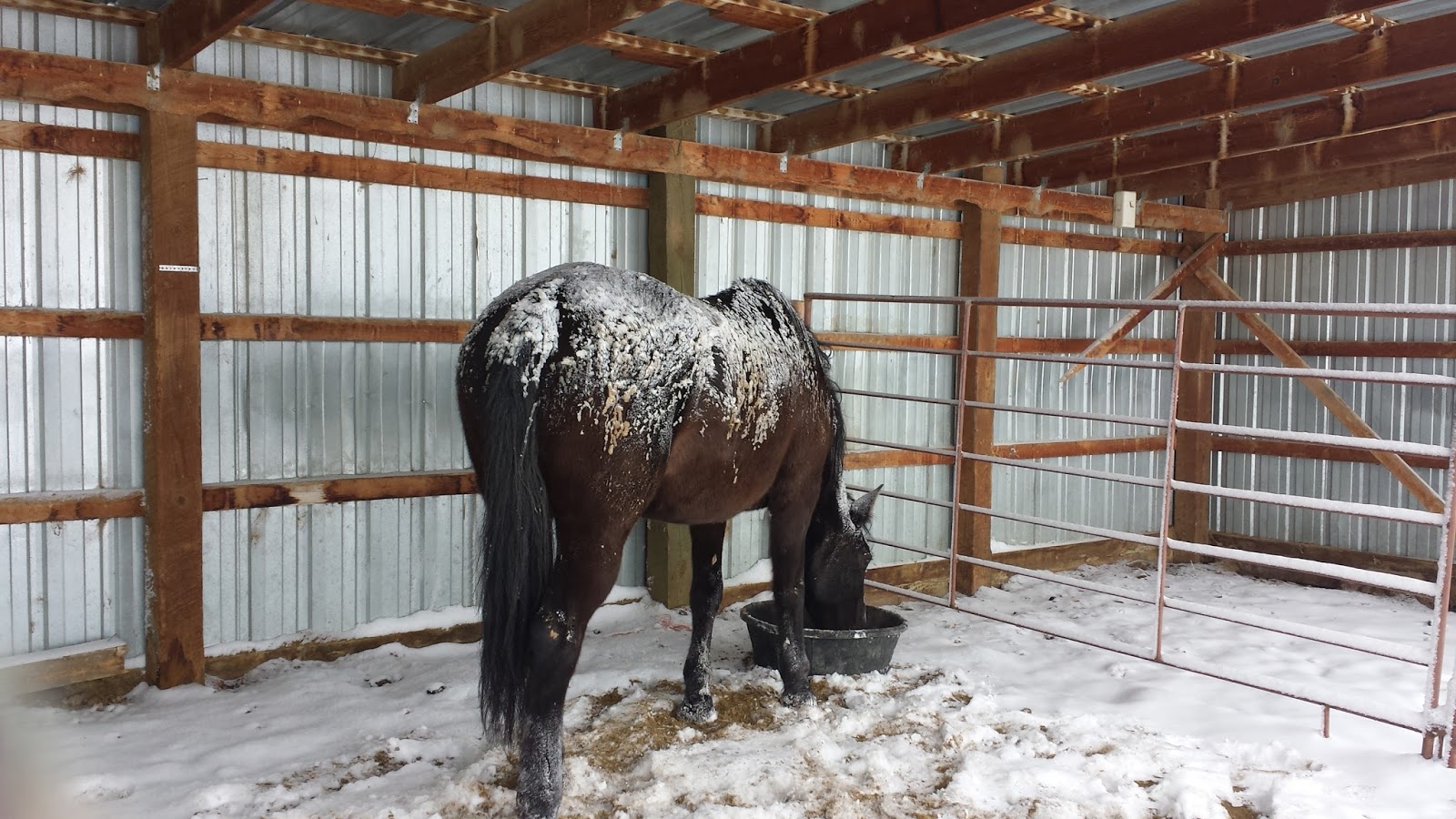 She was a bit chilly and wet, so I spent some time roughing up her coat with my gloves to get some airflow. The snow on her back was good, but the wetness on her sides wasn't. Roughing up her coat helped her dry pretty quickly.