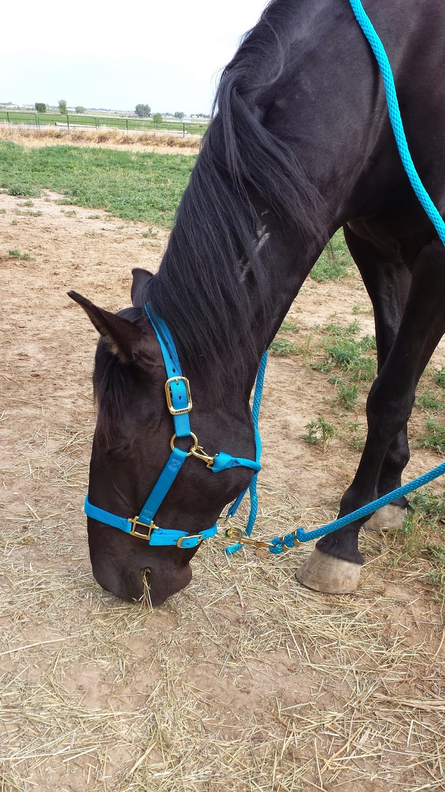 And then Sunday came around and the day didn't go as planned, so I never made it back to Skeeter to put more hay in the feed bag. She got fed in the morning, but I was planning on going back to put a flake or so in the bag to keep her entertained. Didn't happen. In fact, we got so behind schedule that I had L.E. throw her a couple of flakes because I didn't want to go driving into L.E.'s yard at ten o'clock at night.