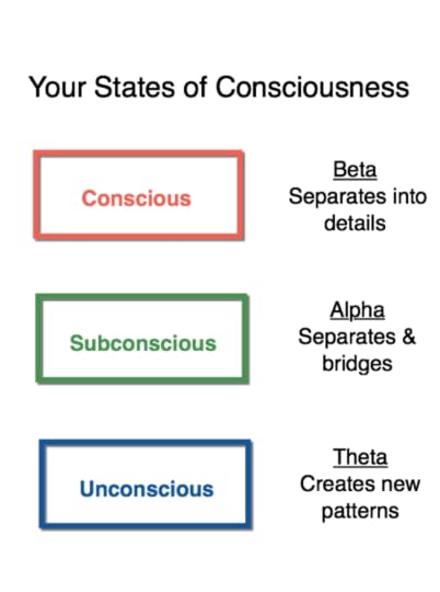 In her theories of learning and intelligence patterns, she references the three primary symbolic languages of the brain (visual, auditory, and kinesthetic), which trigger one of three different “thinking states” – conscious, subconscious, and unconscious. Each of us is comfortable with one particular pattern of visual (V), auditory (A), and kinesthetic (K) as they naturally align in our three states of consciousness.