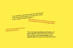 “Eaven often seems to serve the agendas of others rather than following through on her goals. Though she had some stated desires, she often responds to, or is motivated by, others’ decisions and needs, and she seems to achieve success or failure incidentally, instead of as a result of her own actions. Even her emotional responses seem filtered through the judgments and needs of others instead of clear expressions of her feelings and desires. It’s a problem since it keeps your character from truly living and breathing. Secondly, it weakens your scene structure as she meanders through the scene, accounting for time and moving across the stage, but not necessarily doing so with purpose along the path to a specific goal.”