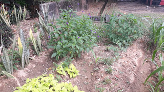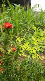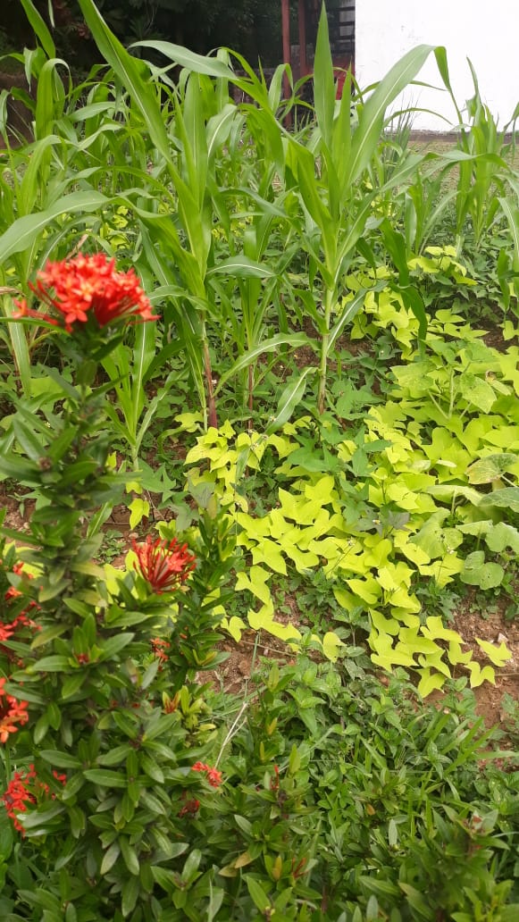 The garden includes sweet potatoes, lemon grass, corn, pawpaw's, pumpkin and kale. Within a small area close to the car garage.