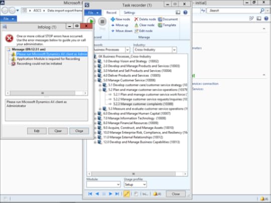 If you are using the new Task Recorder within Dynamics AX and are running it in Advanced mode then you may have noticed that you need to run the client as the administrator before you can record any task recordings. If you are like me, you never go to the trouble of starting AX in that mode, which means that when you try to record a task you get the following reminder and you then have to exit AX restart the client in Administrator mode.