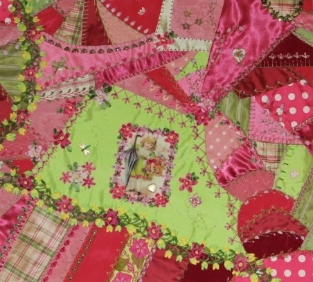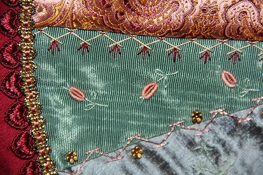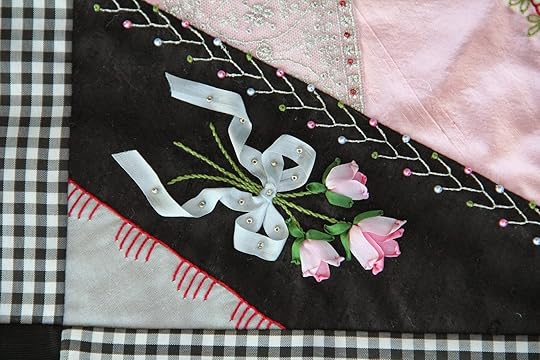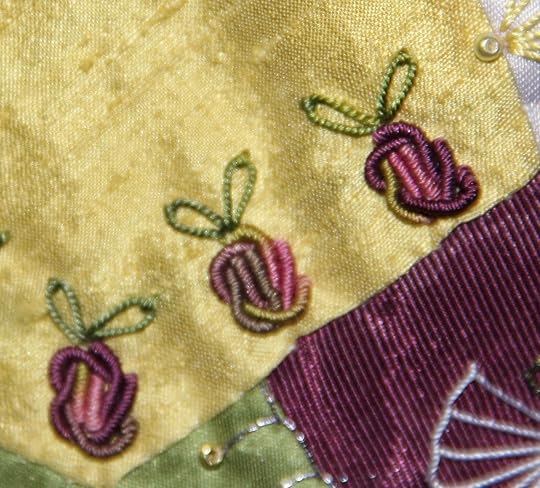 Here is a close up shot of the crazy quilt I did for our book, Quilting...Just a Little Bit Crazy. Little bullion embroidered rose buds can be used to dress up a fan blade.